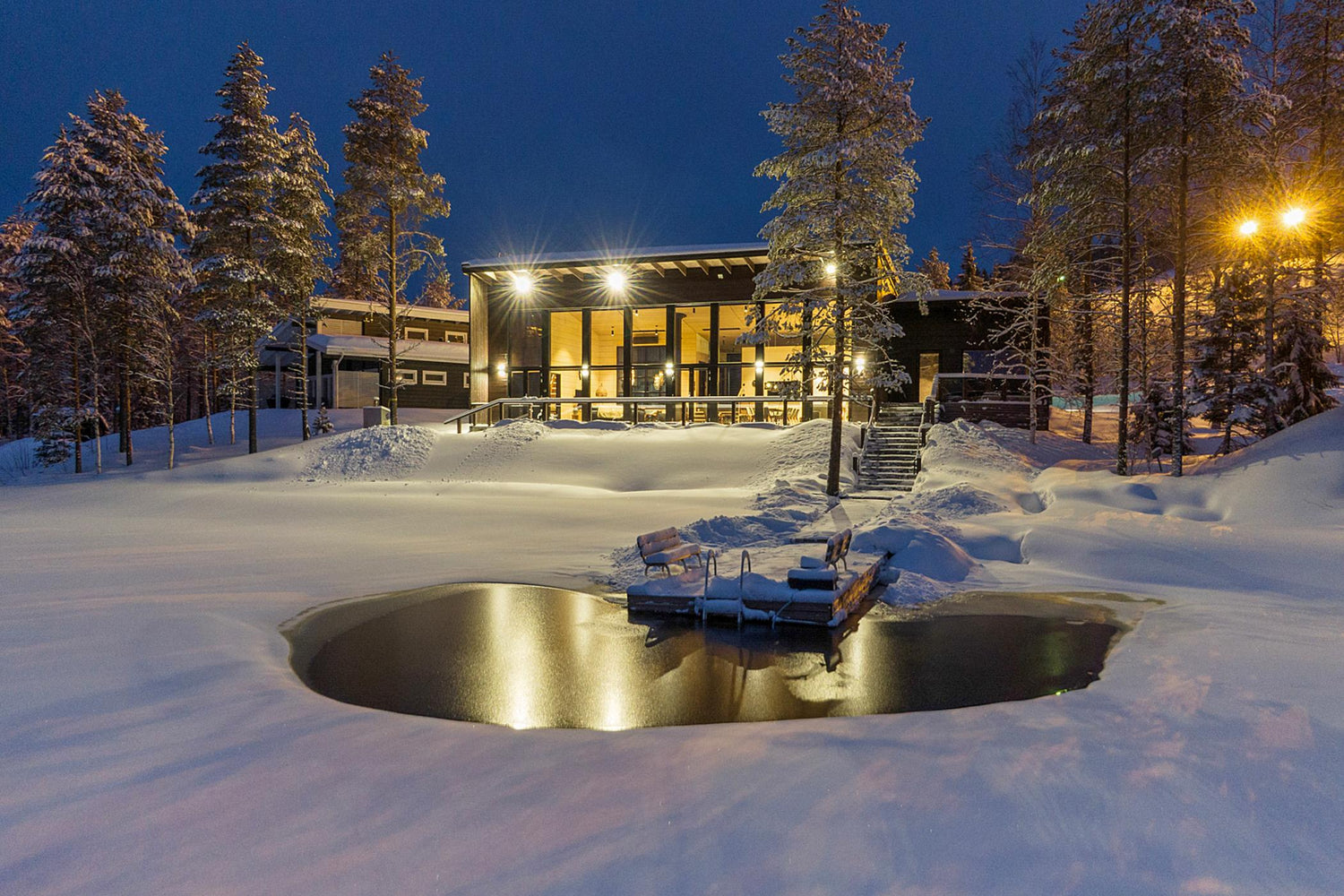 Jos arktinen kylmyys ei houkuta, voit pulahtaa lämpimään porealtaaseen saunan terassilla. Tutustu ja varaa!